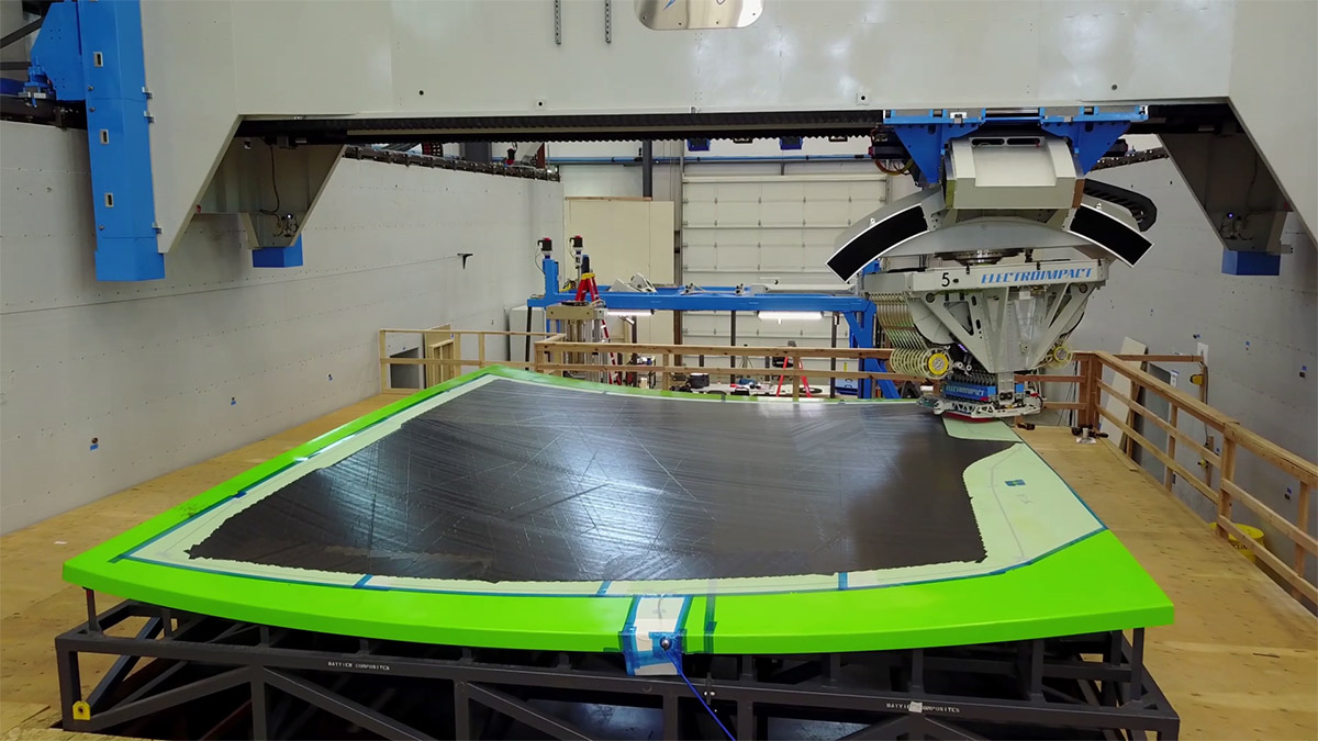 The system has a 7th axis (C') to supplement the more conventional six axes (X, Y, Z, A, B, C) to access the complex curvature in the nose cone area. The machine is equipped with a Q16 head (1/4" x 16 tows) for all of the fairing and adapter parts. The machine is also equipped with an ATL head for production flat charges.