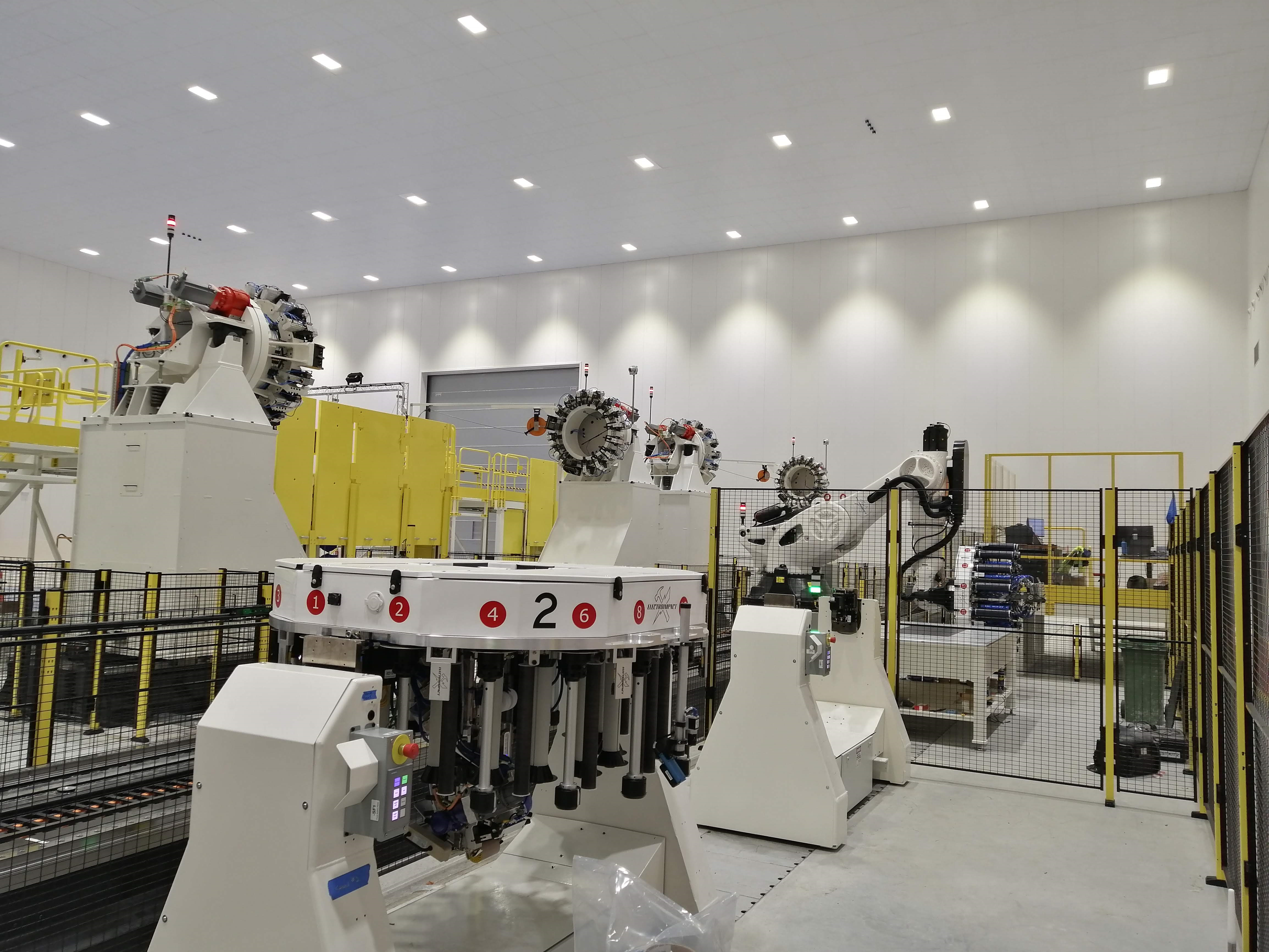 Two fuselage lamination cells, each with a pair of giant 6-axis post machines concurrently laminating on a high-performance rotator. These machines lay 1/2" and 1/4" prepreg