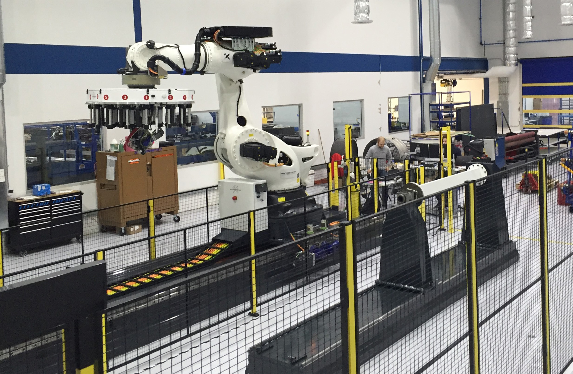 2 Electroimpact accurate robots, 3 high capacity rotator stations, 2 x 1/2" heads, 1 x 1/4" head and 2 inspection platforms.